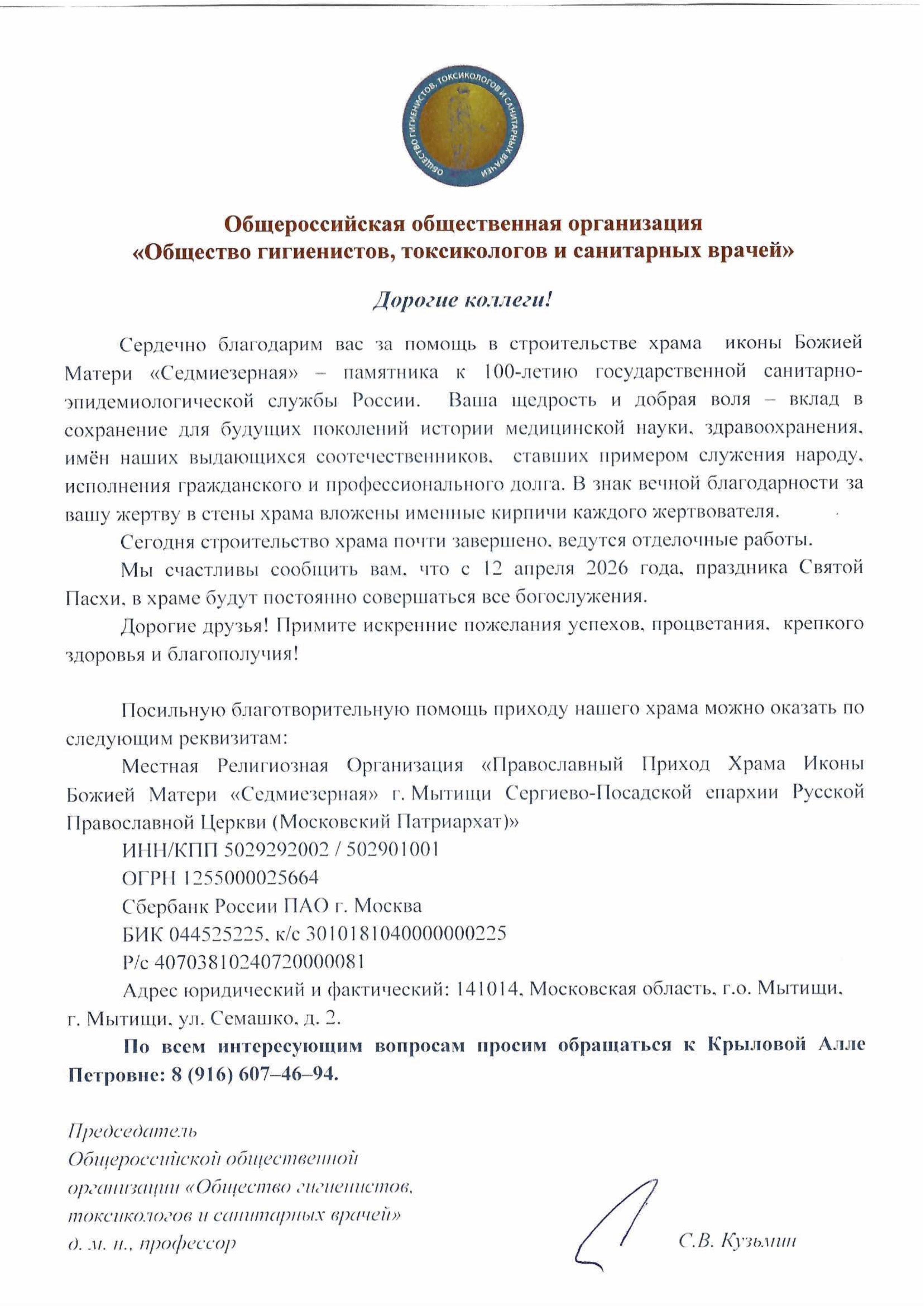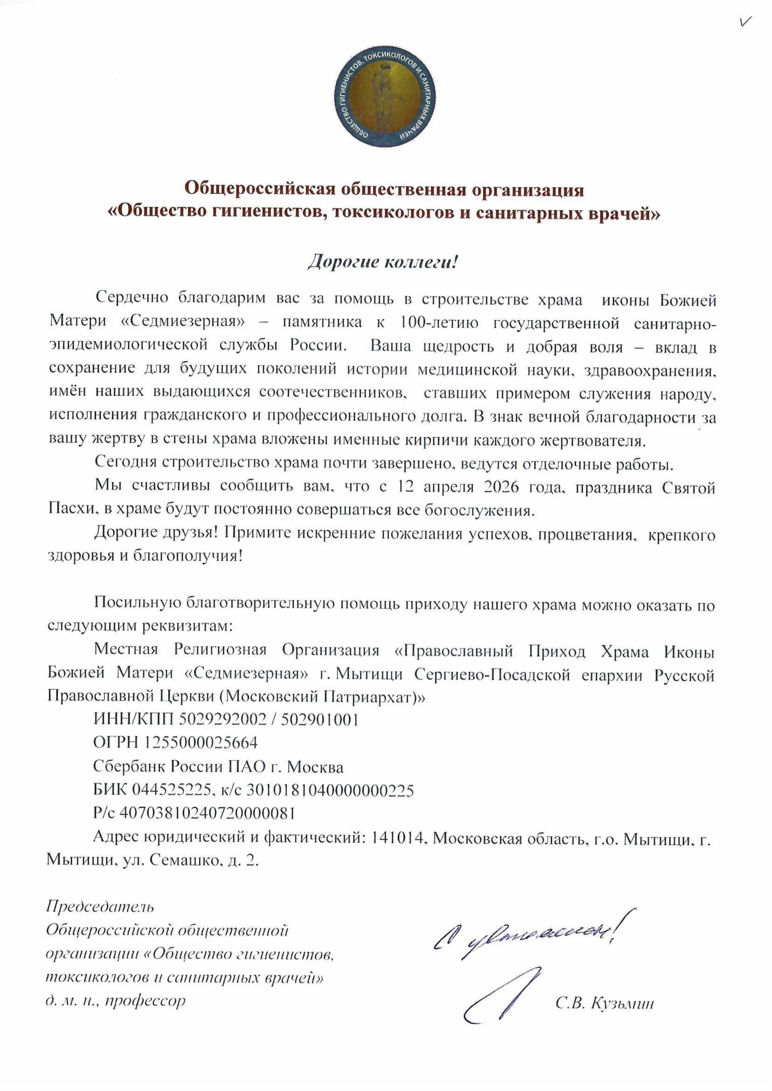 Благодарственное письмо жертвователям